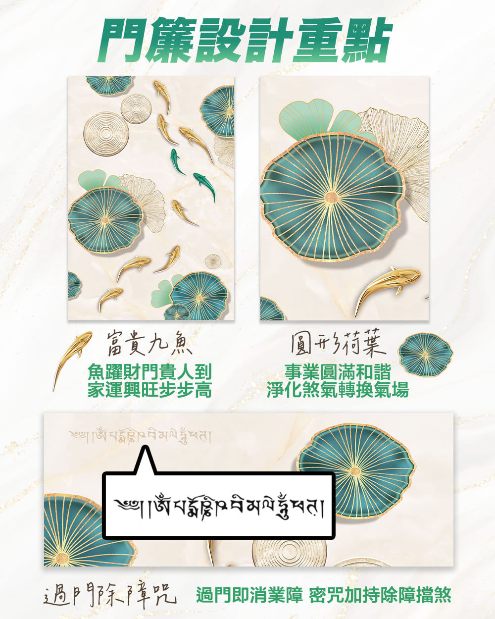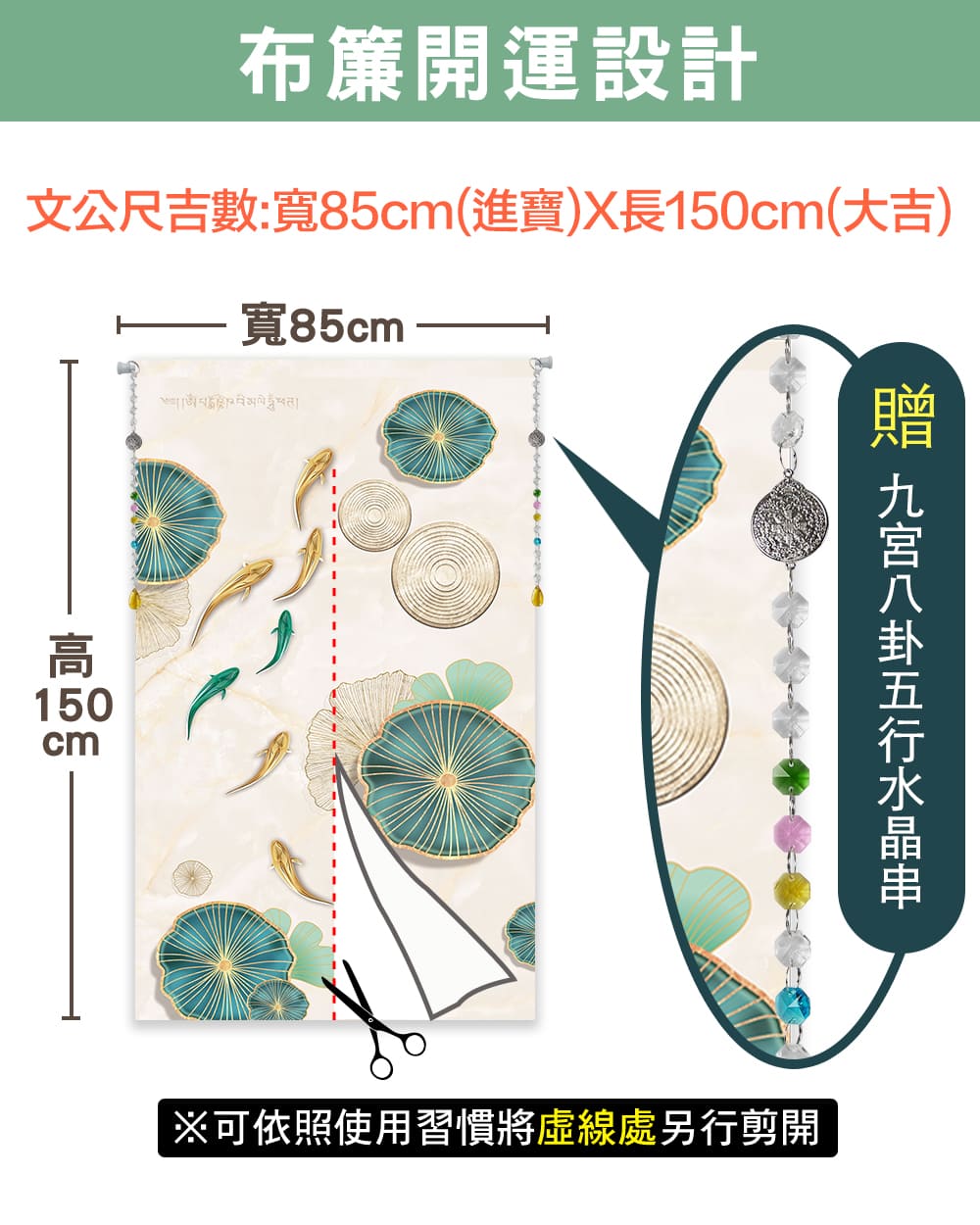 【魚躍財門風水布簾】印有過門除障咒,能淨化業力解財煞,特別搭贈九宮八卦五行水晶串,透過五行水晶串修補五行上的財庫缺陷,結合九宮八卦除財障帶來好財運,掛在布簾上,能正式啟動門連能量磁場,有效阻擋不良煞氣。
