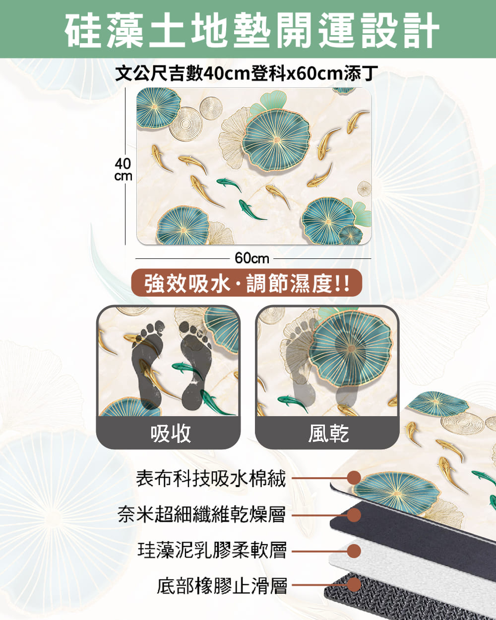 【魚躍財門硅藻土地墊】廁所常常是家中穢氣聚集處,如果無窗不通風則容易導致陰暗潮濕有霉味,就會造成風水上味煞、陰煞等風水煞氣,這款地墊材質採用硅藻泥,具強大吸水速乾的特性,特別適合擺放浴室門口或淋浴間外的地面,保持浴室乾燥乾爽並去除濕氣晦氣,加上尺寸符合文公尺吉數,加強開運與擋煞效果。