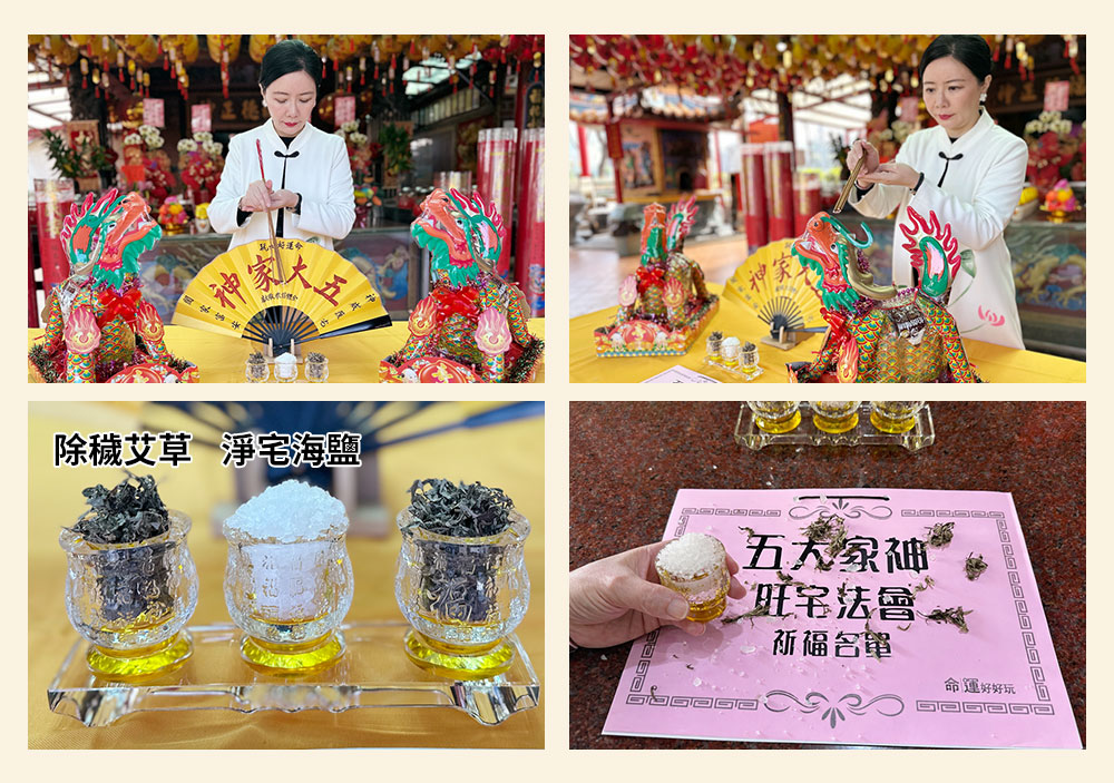 特別選用極具驅邪能量的「除穢艾草」與「淨宅海鹽」,針對每位報名信眾所提供的地址進行精確的迴向祈福儀式。透過法力深度洗滌家宅中堆積的負面磁場與穢氣。迎請五大家神與瑞獸麒麟鎮守入宅,有效化解室內外的風水禁忌與流年煞氣,重新校正受損的家宅能量。徹底淨化淤塞的氣場,進駐財星與福氣。打通家運脈絡,達到「家旺、人旺、事業旺」的圓滿境界!