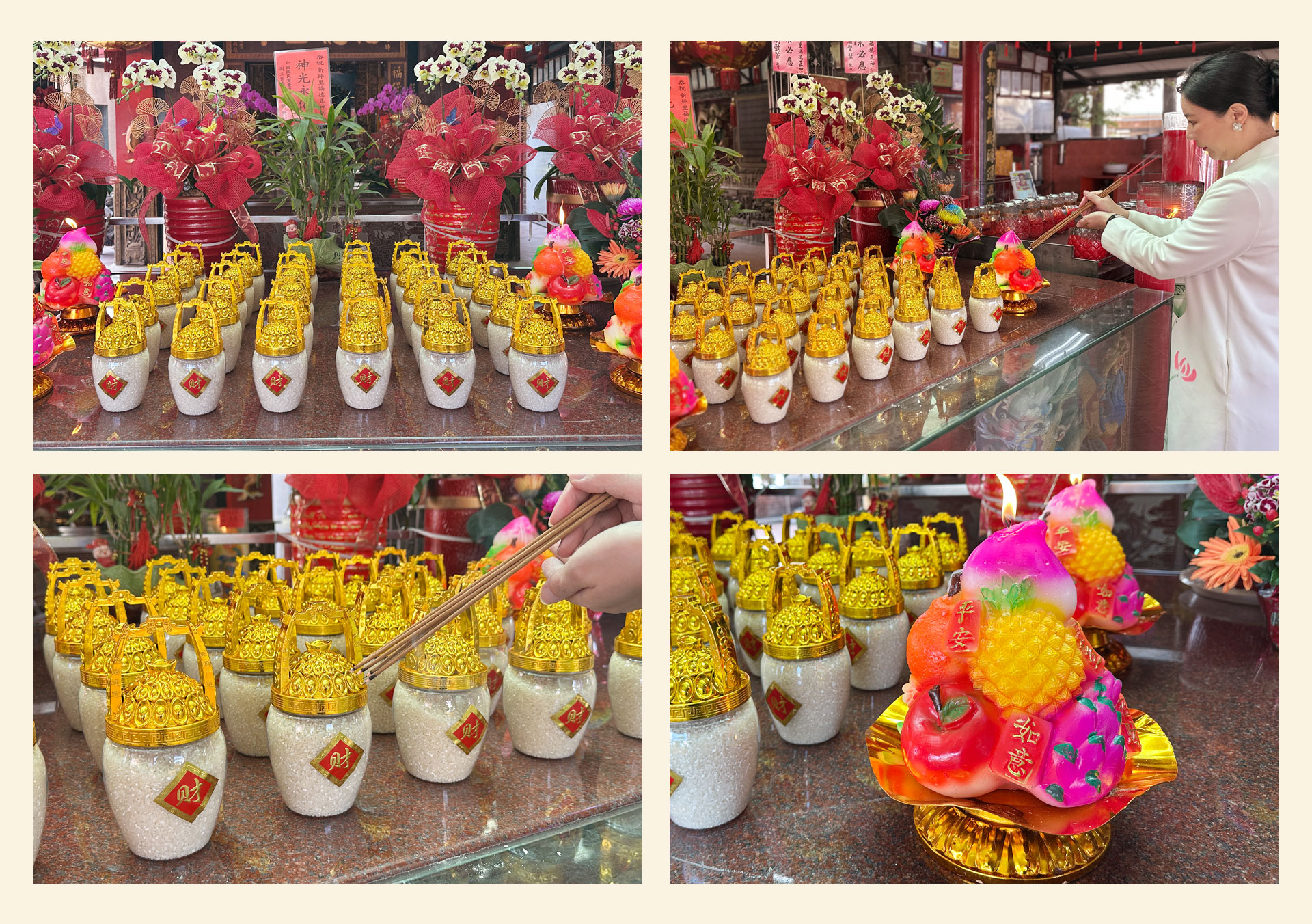 「一桶金財米」象徵著家中的糧倉與財源,在民間習俗中「添米即是添財」。經過法會修法加持,財米將匯聚強大的聚財能量,打造一個穩固的天造家財寶庫,鎖住財氣不外流!同時,透過八種象徵圓滿的吉祥水果燈,將不同的福報能量一一引入家門: