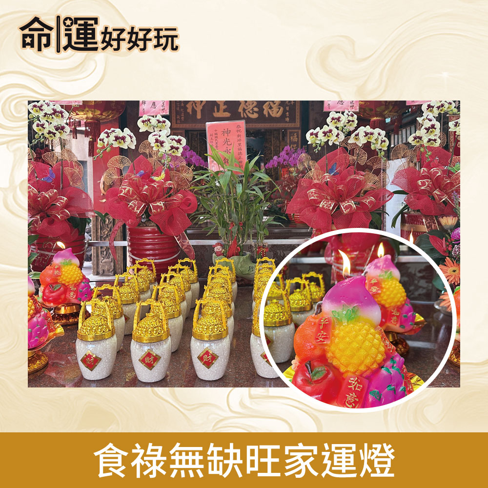 家中的食祿與財庫密不可分。本次特別準備「一桶金財米」結合「八種吉祥水果旺運燈」,誠心供養守護家宅的五大家神,祈請神力護佑全家人整年衣食無憂、食祿豐盈。