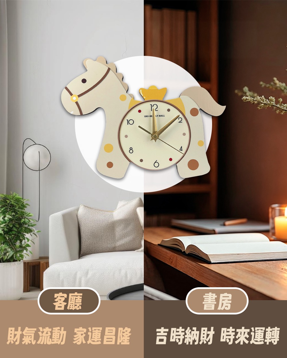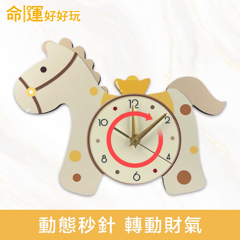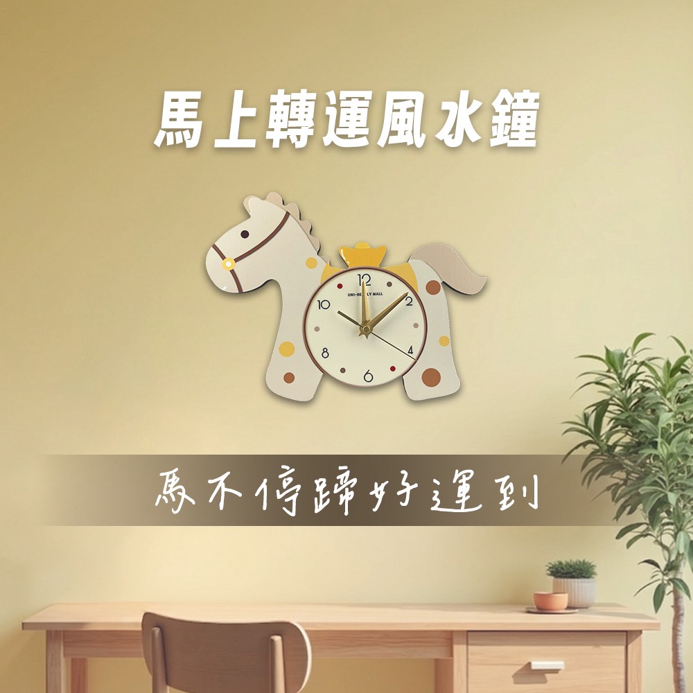 《馬上轉運風水鐘》北歐風童趣小馬設計融合開運元素,馬背上的金元寶不只是裝飾,更象徵著「馬上有錢」,藉由指針滴答交替的規律運行,將靜止的磁場轉化為活絡的循環能量,象徵著「財源滾滾、去舊迎新」。造型討喜、體積適中非常適合小家庭,可懸掛於牆上也可擺放於桌面,既美觀又實用,在壓力倍增的日常中,療癒轉動好運氣場,開啟時來運轉的最佳氣勢。