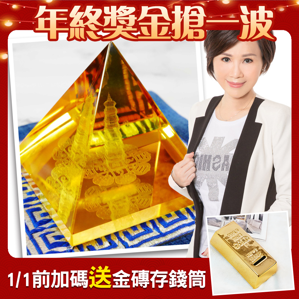 此款「功成名就黃晶文昌塔」有別於一般純以文昌塔建築為外型的設計,改以金字塔為外觀主體,再融合文昌塔及另外兩大設計進入其中,從側面能看到文昌塔會折射到金字塔頂端,層層加高的塔樓,就象徵所有功名利祿皆能達到顛峰,成就頂尖;文昌塔周圍一圈以文殊心咒環繞,可獲得文殊菩薩庇佑,智慧灌頂、文思泉湧;最後以九宮八卦陣為底,事事順利吉祥,避開一切阻礙!