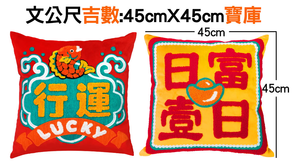 此開運系列抱枕整體設計特別符合文公尺雙財吉數,長、寬皆為45公分=「寶庫」,同時興旺正、偏財運,助家中寶庫吸進八方金銀財寶。