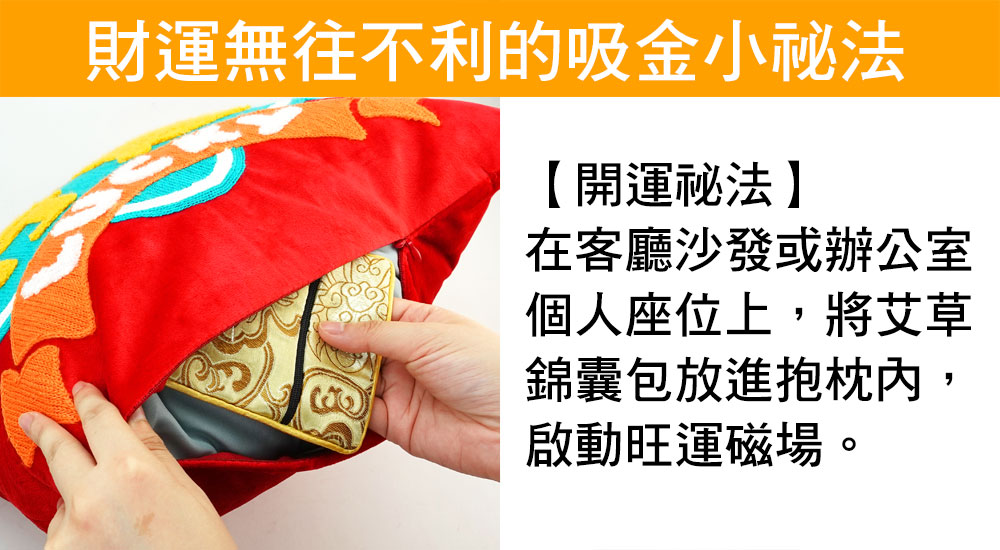 而抱枕附贈的獨家開運祕寶「艾草錦囊包」,內含艾草、抹草等多種特製除穢配方,能化煞避邪驅退小人,以及「五方財庫符」解漏財、廣招五方財氣,因此擺放此開運抱枕,自然而然就能吸引財運及貴人聚集。