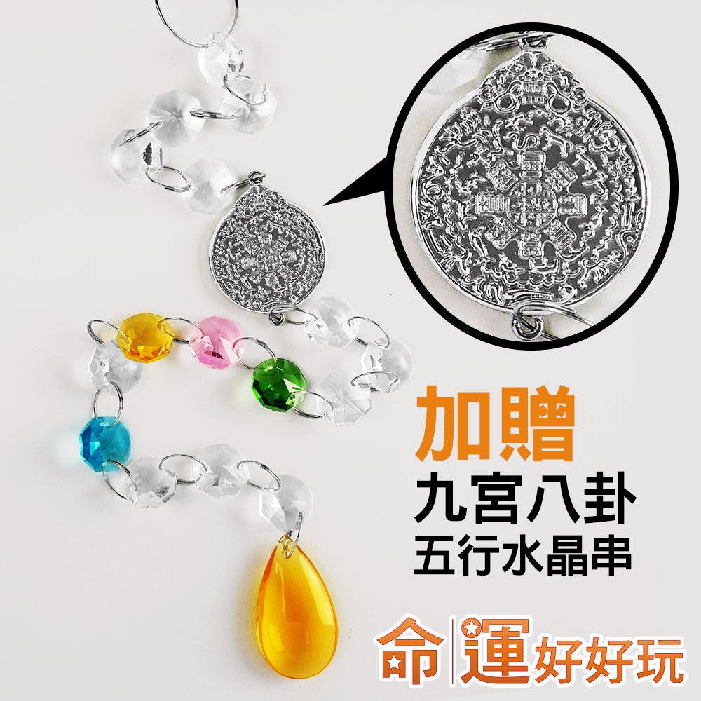 特別加贈獨家設計的九宮八卦水晶串2串,先掛上布簾後可將水晶串掛在布簾伸縮桿兩側。水晶串的設計中含有五行水晶能修補居家磁場中五行上的缺陷並透過五行循環啟動正能量磁場,另水晶串上的九宮八卦藏傳圖騰可有效化解環境煞氣,使風水布簾的開運效果更強大!