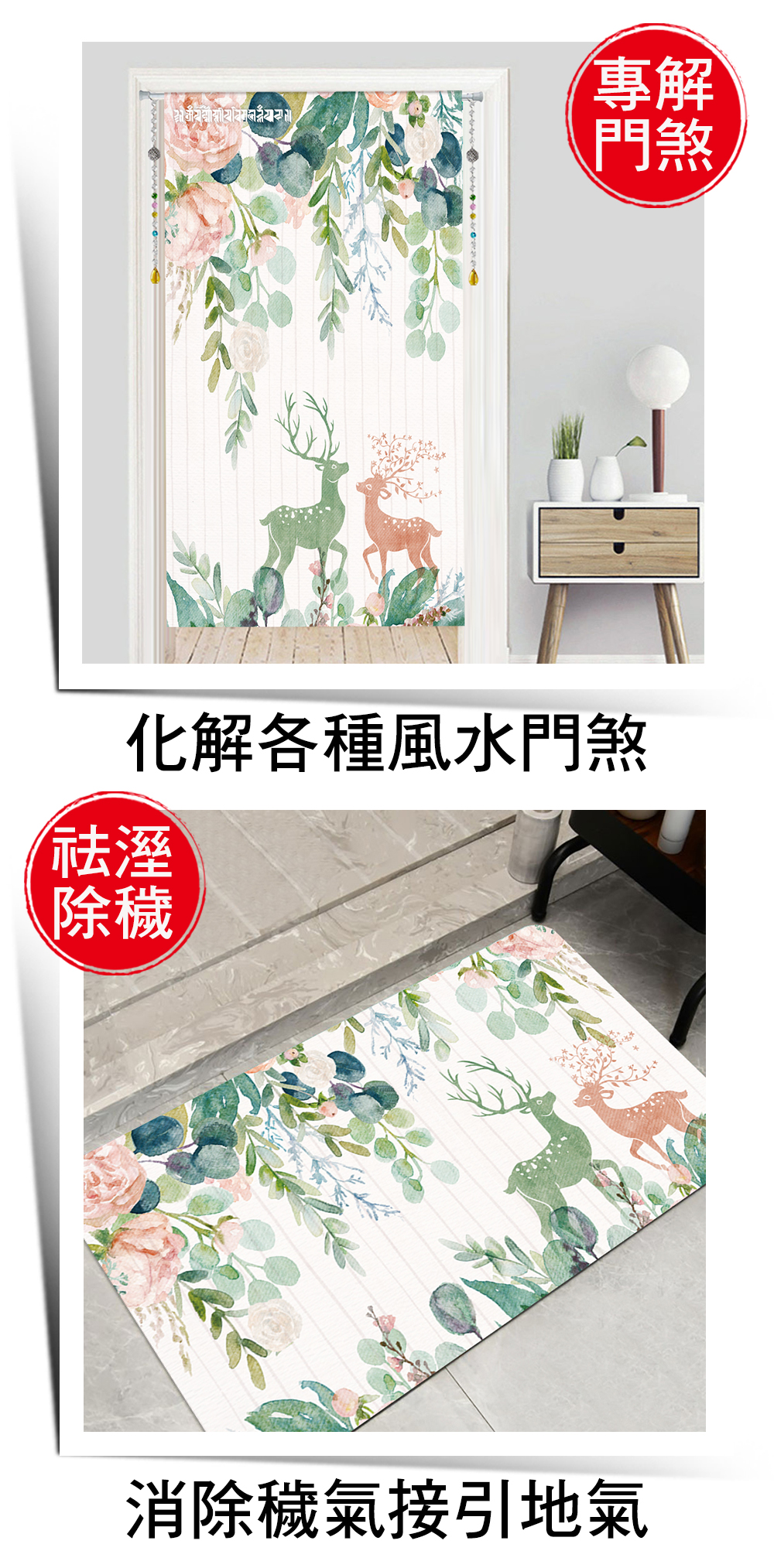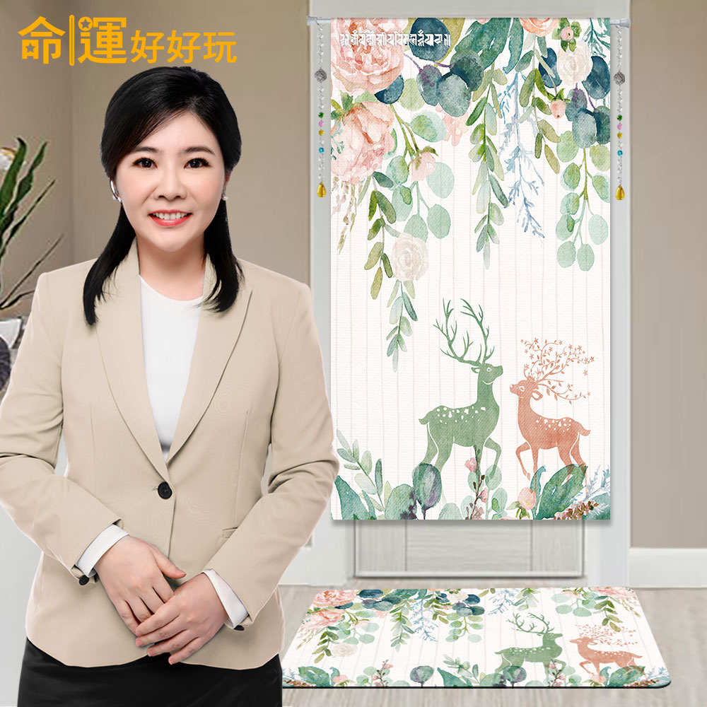 建立居家好磁場最簡易的方式就是使用門簾及地墊,家內裝潢一有不小心就會釀成不好磁場的格局,布簾+地墊套組就能夠很好的一次解決居家常見的問題。雙鹿呈祥風水布簾+地墊在設計方面選用了清新的北歐鄉村風,讓除穢解煞的同時還能保持家居美貌,布簾跟地墊皆含有雙鹿對視及玫瑰花簇的開運小祕法,能夠讓家內男女主人氣氛和諧,以此帶旺家中各方財運及家運。