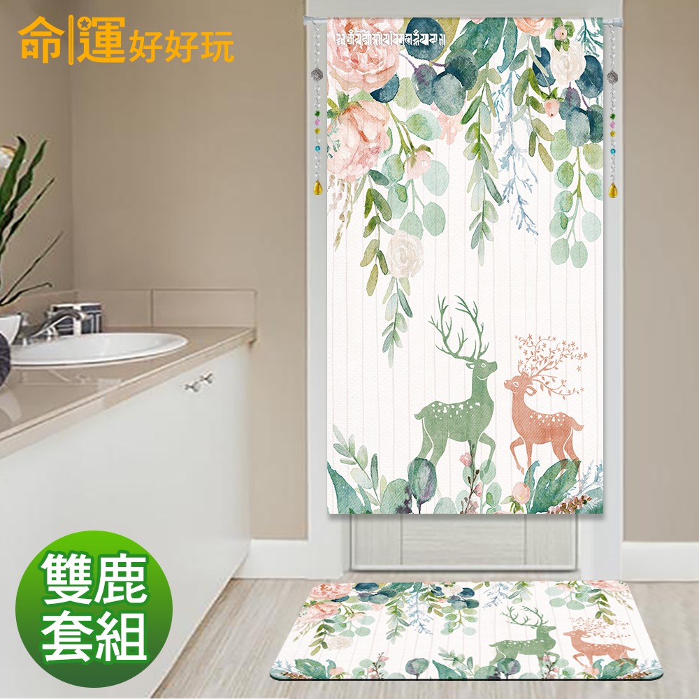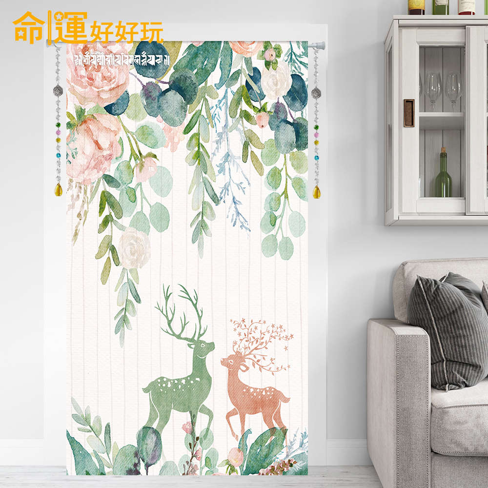 家中浴室門口放雙鹿呈祥風水布簾,有阻擋晦氣及負面磁場的作用,還能夠化解門煞問題。雙鹿風水呈祥布簾上有雄雌雙鹿,代表著相生相望且有著「雙祿」寓意,因此可以帶旺正財及偏財,提升家中財運;玫瑰花簇滿團和氣,能促進家運和諧。左上角還暗藏藏傳的「除障咒」,有助於淨化業障、化解各式財煞!