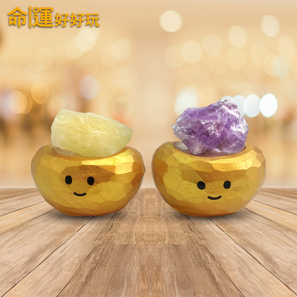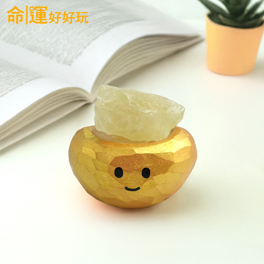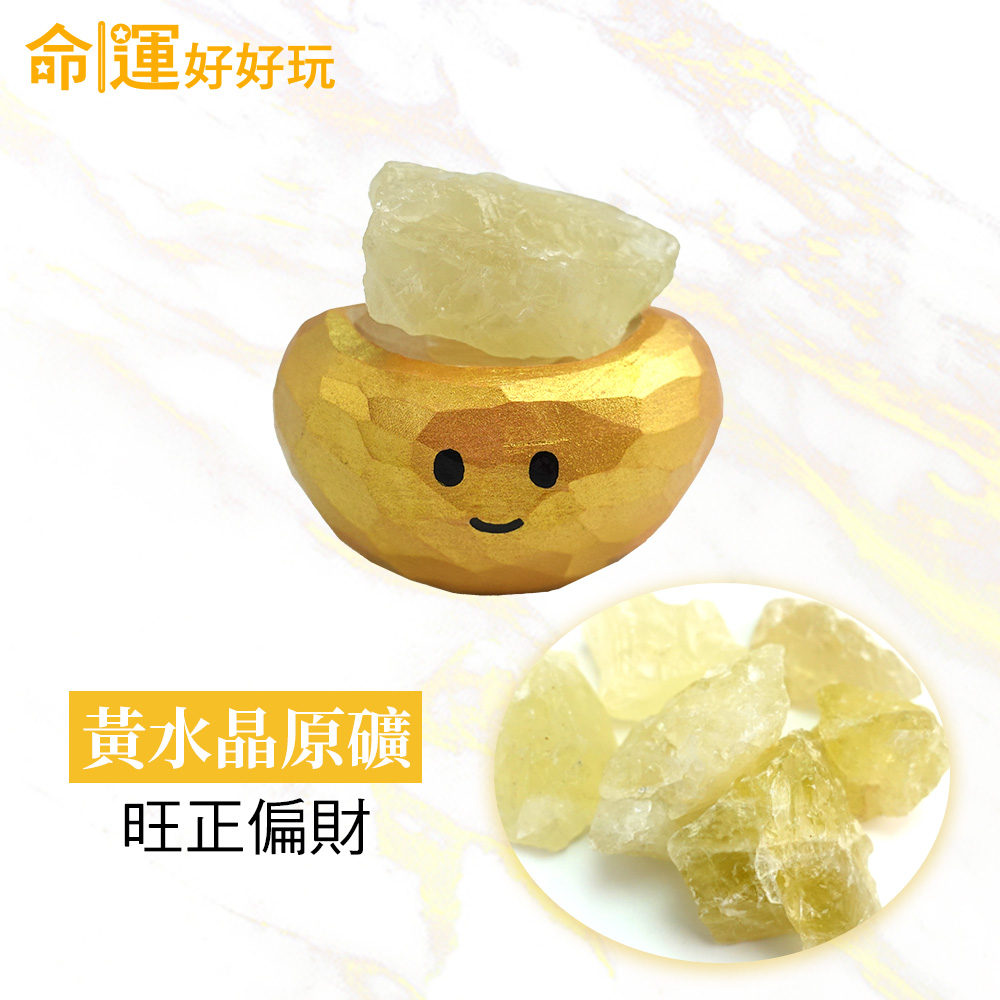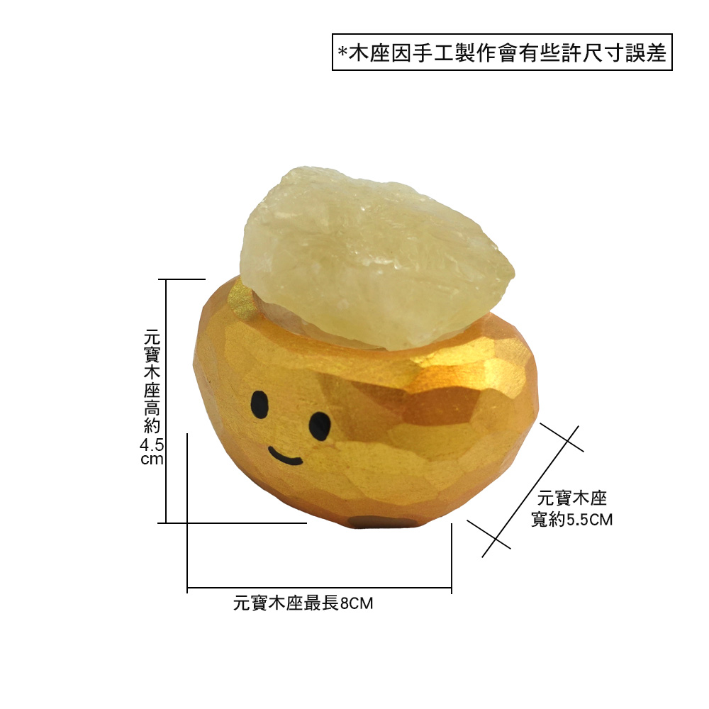礦石採自行黏貼設計,可依喜好調整角度與層次;手工木雕元寶每件紋理皆獨一無二,天然黃水晶大小、形狀、色澤略有差異更具收藏感。Q萌元寶寶閃耀吸睛,送禮自用兩相宜,是療癒系開運小物必備首選。