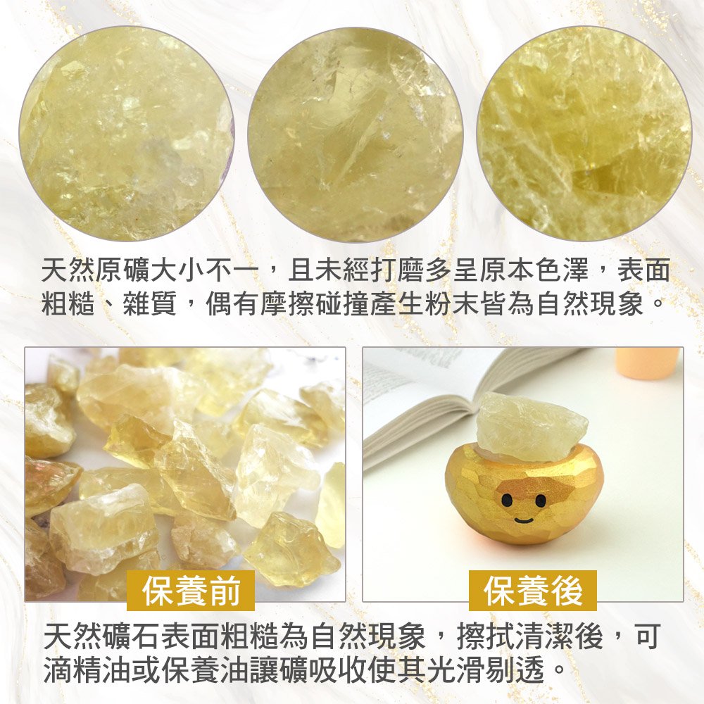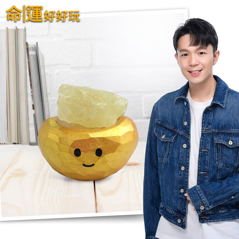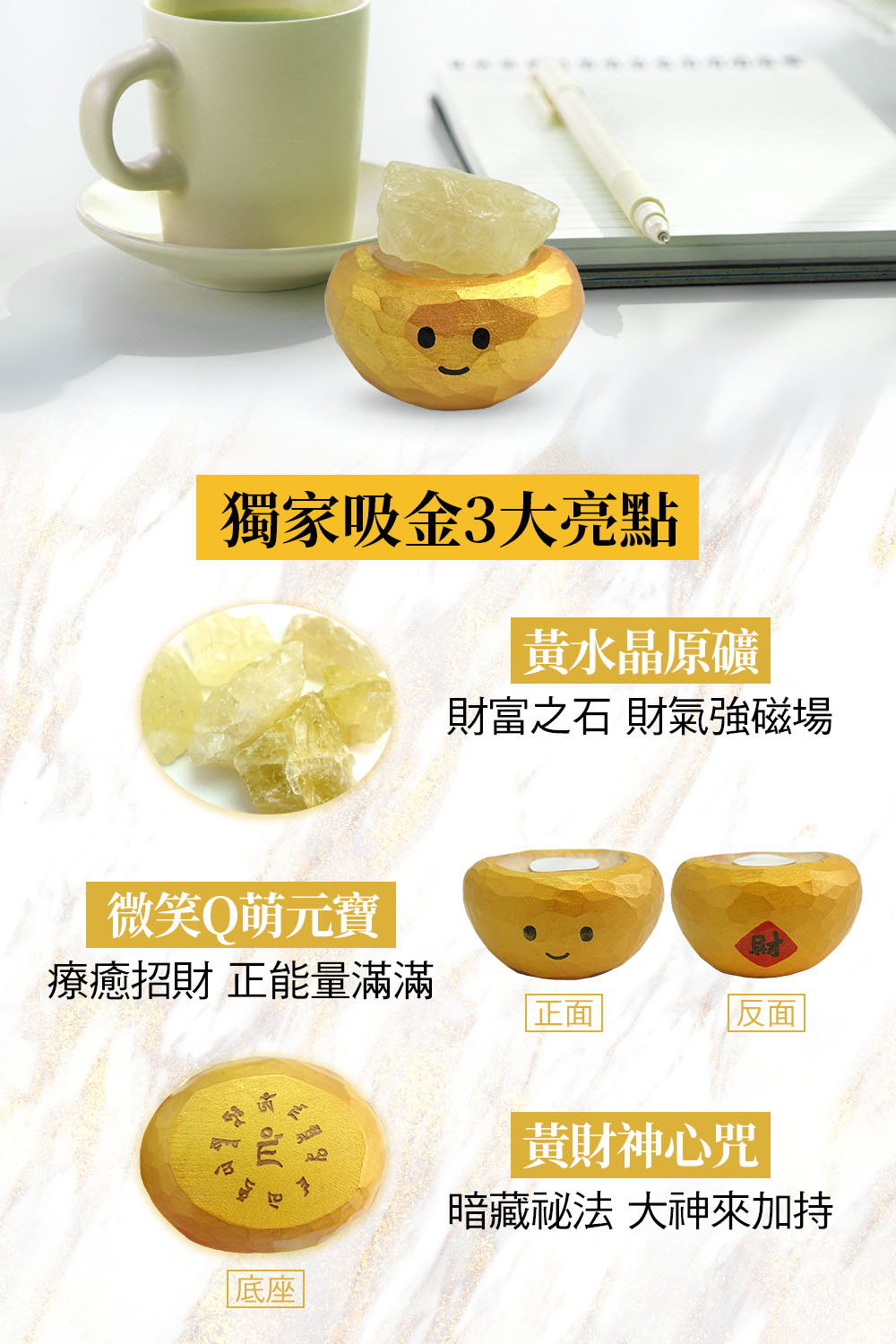礦石採自行黏貼設計,可依喜好調整角度與層次;手工木雕元寶每件紋理皆獨一無二,天然黃水晶大小、形狀、色澤略有差異更具收藏感。Q萌元寶寶閃耀吸睛,送禮自用兩相宜,是療癒系開運小物必備首選。