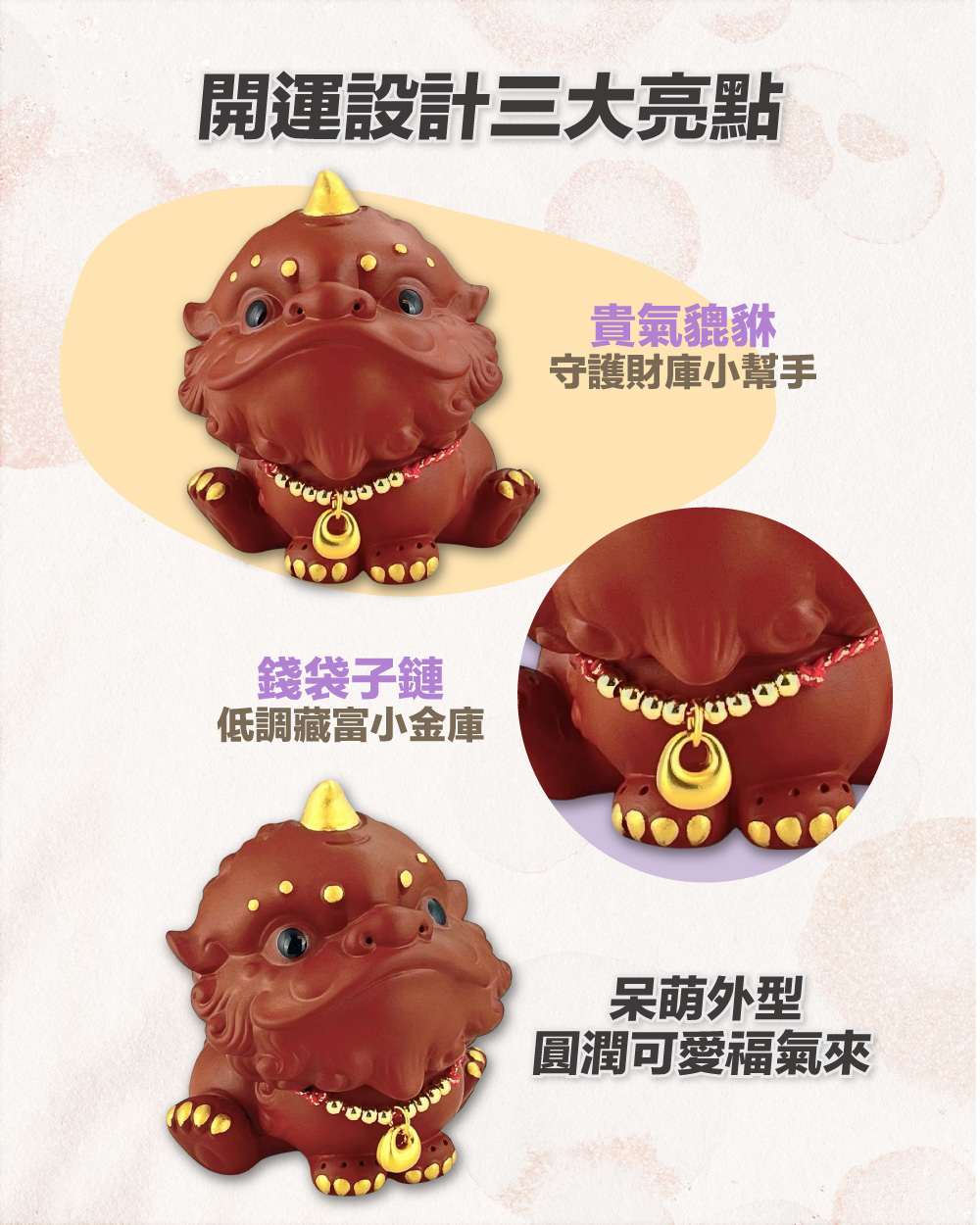 另外搭配「錢袋子綁繩」就像替你的錢包打結、幫財庫上鎖,把收入、業績、財運好好綁住、收進庫裡。外表則是軟萌福態、喜氣滿滿,屬於那種「看起來很可愛、其實很會守」的類型。擺在桌面、櫃台、玄關或辦公室,一眼就有財氣被照顧好的安心療癒感。