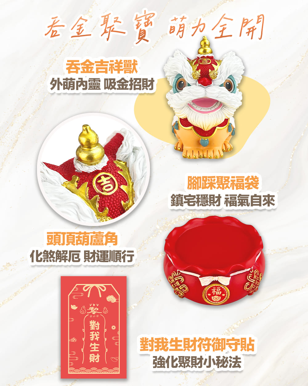 這款萌寶吞金獸外萌內靈,蘊藏吉祥能量,能將八方財氣吞納入宅;頭頂特別設計葫蘆角造型,葫蘆在傳統文化中象徵收煞聚福,可阻擋財煞,讓財運流動更加順暢;腳踏聚福袋,寓意鎮穩福氣、踏牢財基,象徵財富穩穩入袋、好運長久守住。