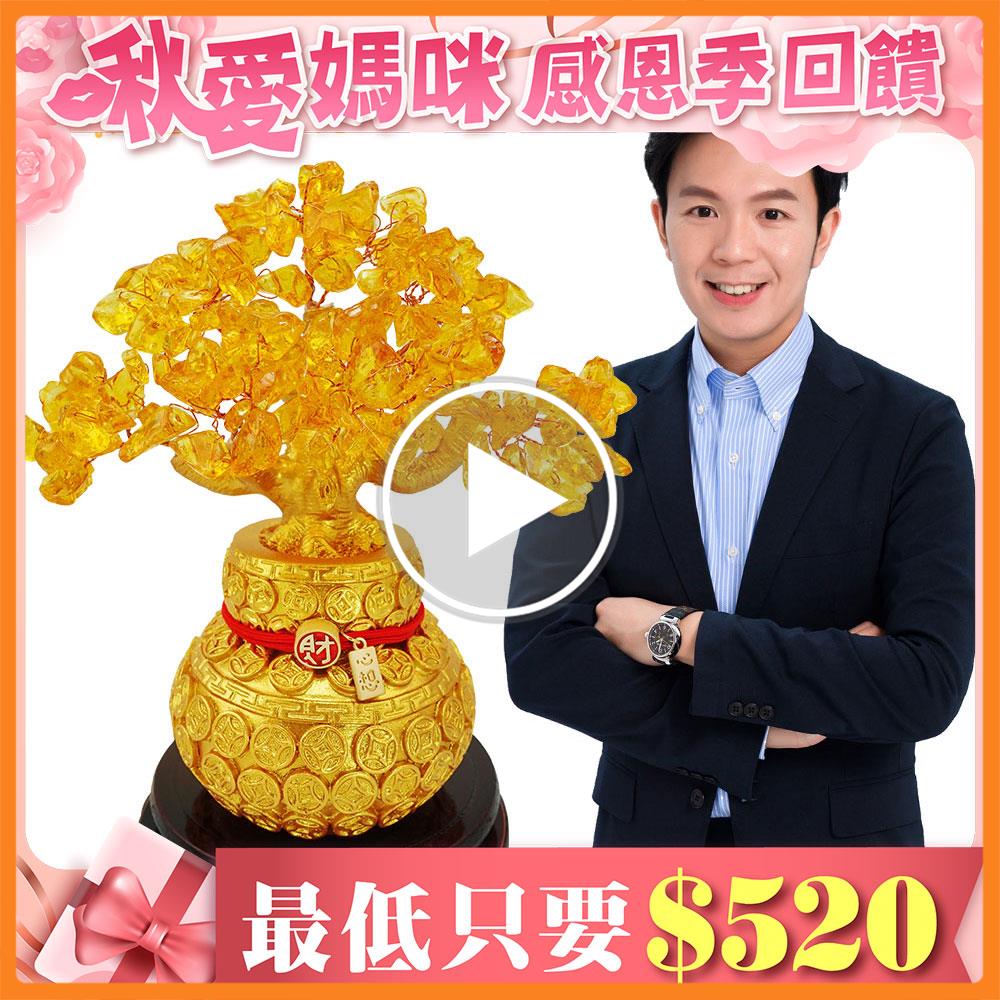以「樹木」作為開運擺件這樣的設計,在風水學中被稱為「活性能量陣法」,因樹木象徵生生不息的生命活力,在樹上點綴天然的黃水晶寶石,能讓居家的財富能量像樹枝般開枝散葉,催發財機,宛如搖錢樹,並且以百財葫蘆袋做為根基,立體雕刻的百餘枚古銅錢,象徵將財富盡收入口袋中,最後以招財鴻運線繫住擺鎮,搭配附贈的財庫符,將財氣緊緊鎖在家中,化解所有漏財問題!