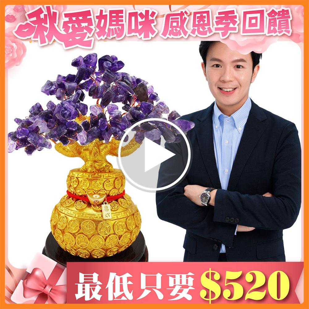 以「樹木」作為開運擺件這樣的設計,在風水學中被稱為「活性能量陣法」,因樹木象徵生生不息的生命活力,在樹上點綴天然的紫水晶寶石,能讓事業貴人的能量像樹枝般開枝散葉,催發人緣財脈牽引事業財,並且以百財葫蘆袋做為根基,立體雕刻的百餘枚古銅錢,象徵將財富盡收入口袋中,最後以元寶鴻運線繫住擺鎮,搭配附贈的財庫符,象徵鴻運當頭,將所有人緣財氣緊緊鎖在家中,帶來各路貴人相助!